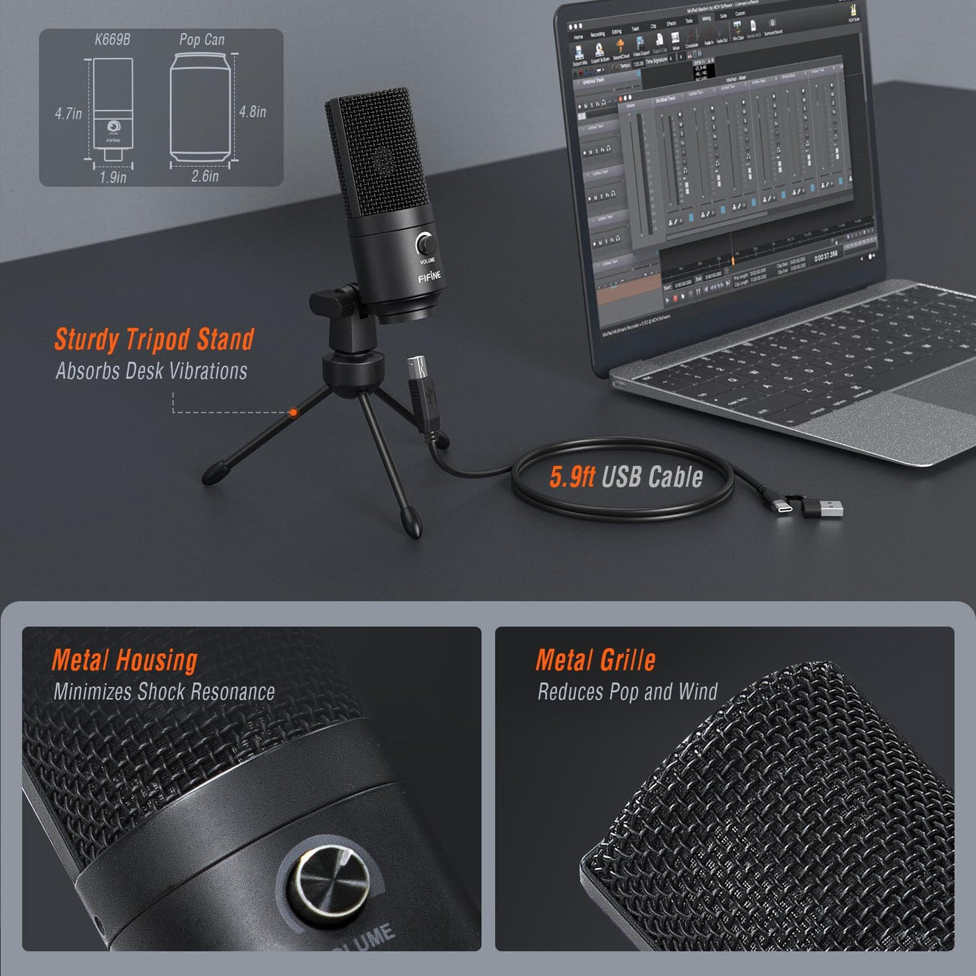 The FIFINE K669B USB Microphone is a plug-and-play condenser mic designed for clear voice capture on computers. With a solid metal build, cardioid pickup pattern, and onboard volume control, it’s suited for recording, streaming, meetings, and everyday content creation.