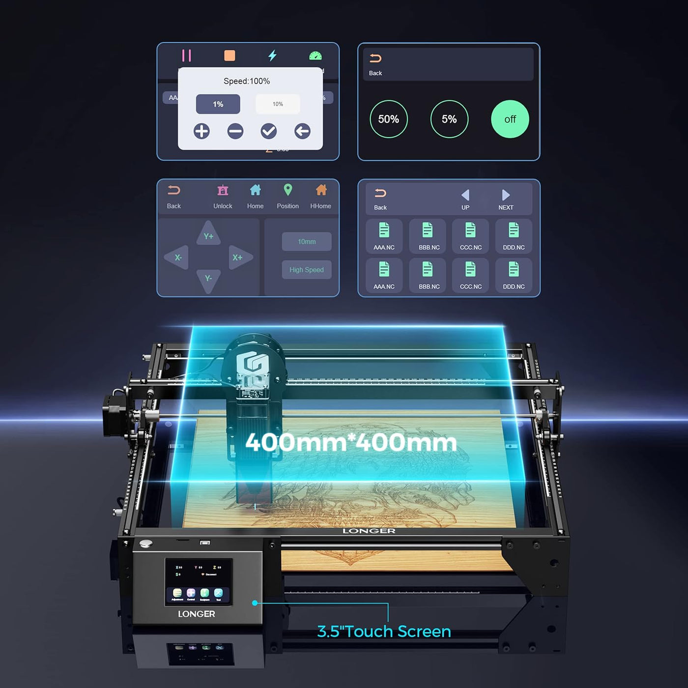 The Longer RAY5 Laser Engraver is a high-power, dual-beam machine built for fast, precise cutting and engraving. With speeds up to 10,000 mm/min and the ability to cut thick wood and acrylic, it delivers strong performance for both hobby and professional use. The 400 × 400mm workspace can be expanded to 850 × 400mm with an optional kit, giving you more room for large projects. A 32-bit motherboard, multiple data transfer options, and a 3.5" touchscreen make operation smooth and convenient. Safety features like a protective cover, included glasses, and automatic shake-detection shutoff help keep every session secure.
