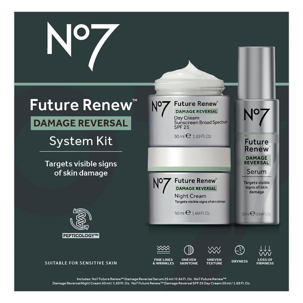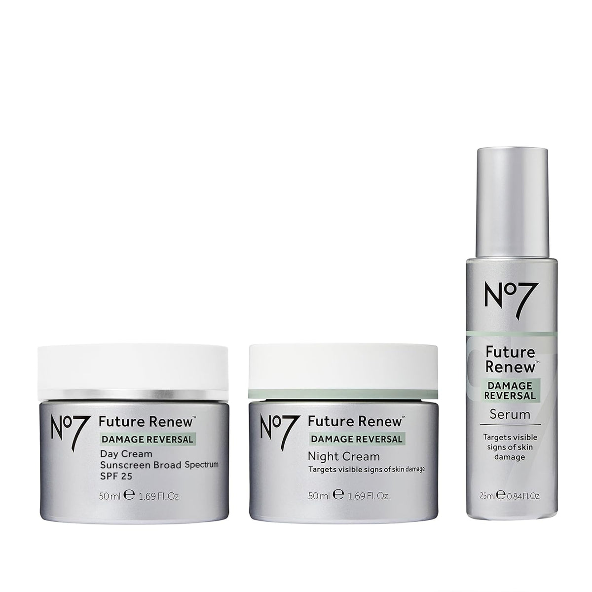 The No7 Future Renew Damage Reversal Skincare Set is a complete day-to-night routine designed to repair and visibly reverse the effects of sun exposure. Powered by No7’s world-first peptide technology, each product works to support the skin’s natural self-repair process while improving tone, texture, and firmness.