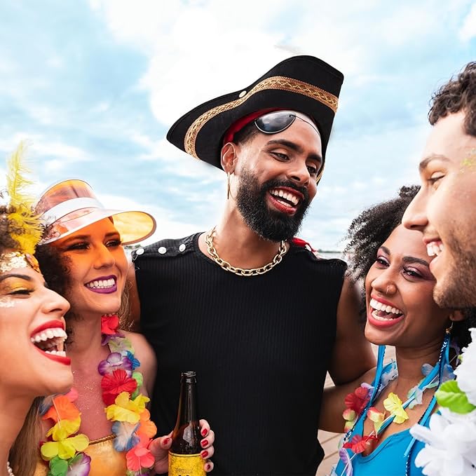 The Juvale Pirate Tricorn Hat is a great option for anyone looking to complete a pirate or historical-themed outfit. Made in a classic black design with a traditional kettle brim, it offers the familiar three-cornered shape seen in pirate movies and Revolutionary War reenactments. The attached feather adds a simple but eye-catching detail, making the hat stand out in costume photos or themed events.
