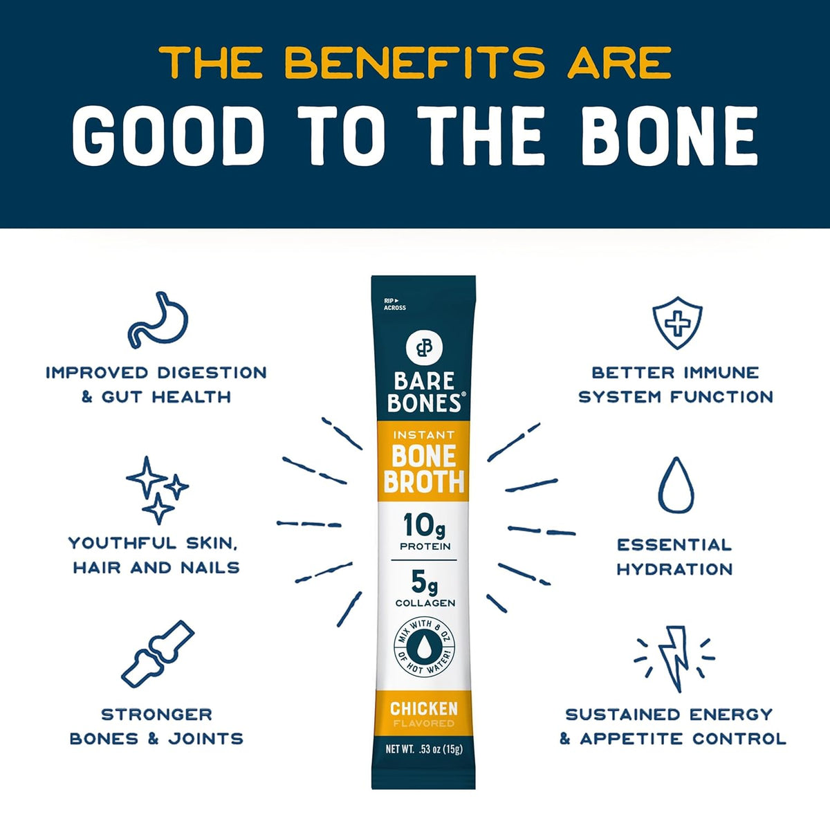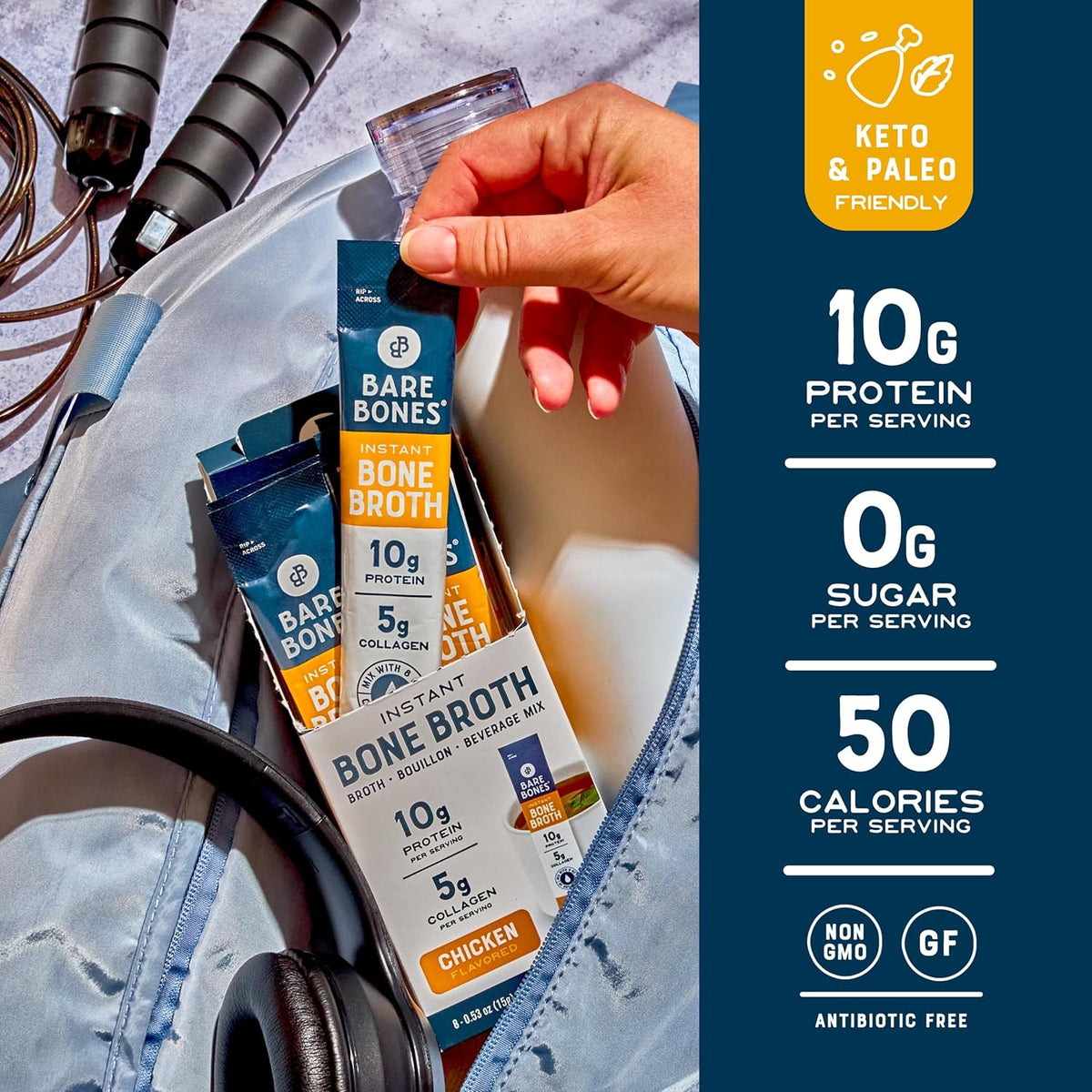 Bare Bones Instant Chicken Bone Broth Packets deliver rich, savory flavor with real chicken bone broth, herbs, and spices—plus 10g protein and 5g collagen per serving. Keto, paleo, gluten-free, and perfect for on-the-go nourishment.