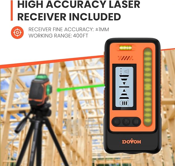 The DOVOH H3-360G Laser Level is a great choice for professionals who need reliable accuracy outdoors. It uses a high-performance receiver to detect the laser line clearly even in bright sunlight, giving you a working range of up to 400 ft when paired together. The 110mW green laser diodes are significantly brighter than standard 30mW systems, helping extend visibility and performance for exterior construction, landscaping, and large outdoor layouts.