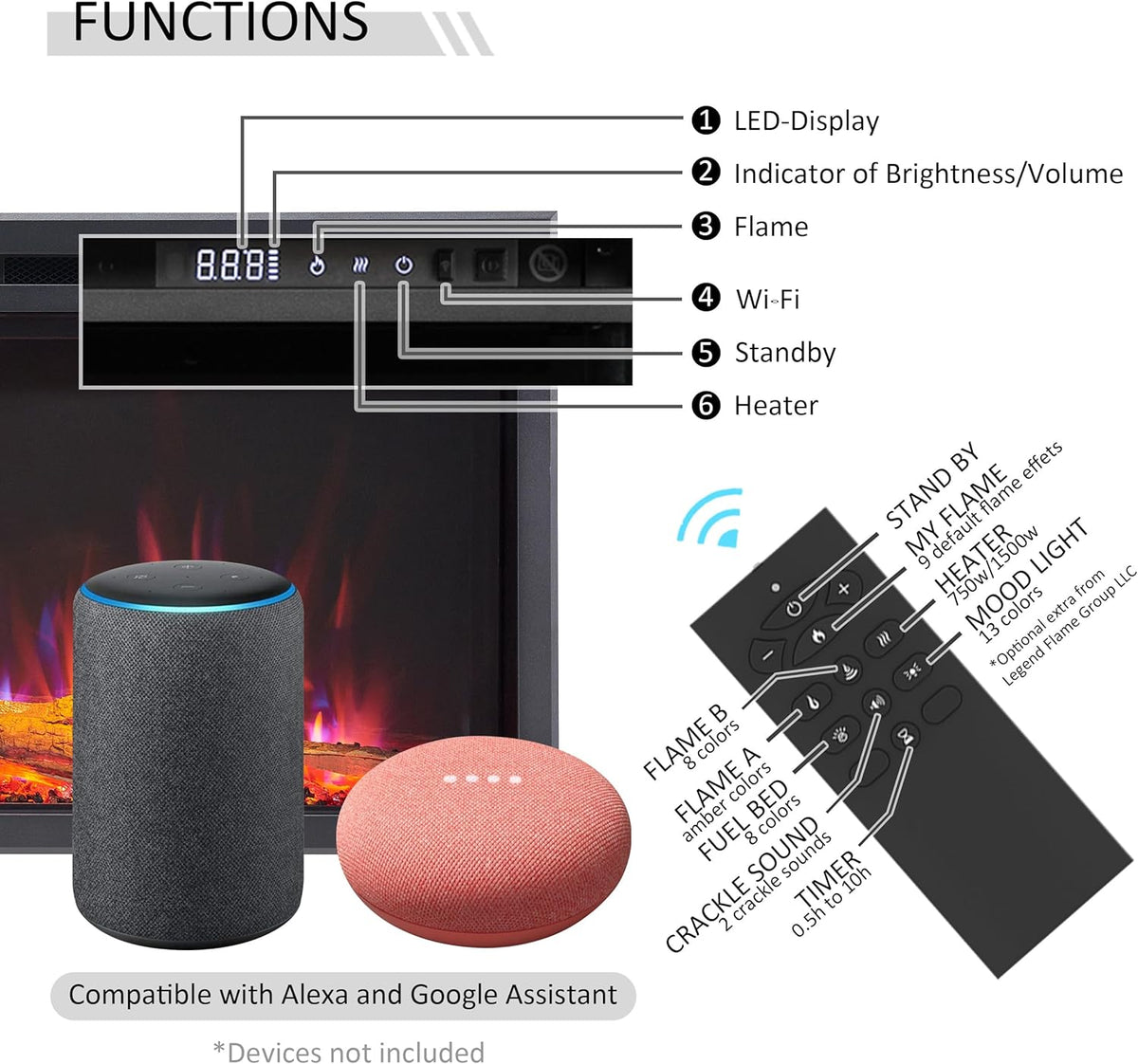 This smart electric fireplace supports Wi-Fi connectivity and works with Alexa and Google Assistant, allowing effortless control over heat, flame colors, brightness, and power using voice commands or the included remote. Dual heating options (750W and 1500W) provide efficient supplemental warmth, while the flame display can be enjoyed independently throughout the year.