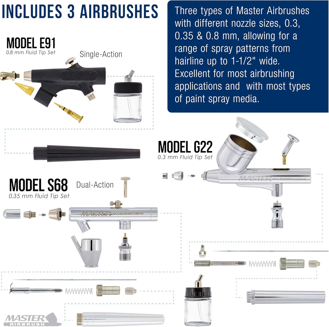 This all-in-one system includes three of Master Airbrush’s top-selling airbrushes, ensuring you have the right tool for every job. The G22 dual-action gravity-feed brush is perfect for precision detail work, while the S68 dual-action siphon-feed is excellent for broader coverage and frequent color changes. The E91 single-action siphon-feed airbrush is ideal for beginners and simple applications.