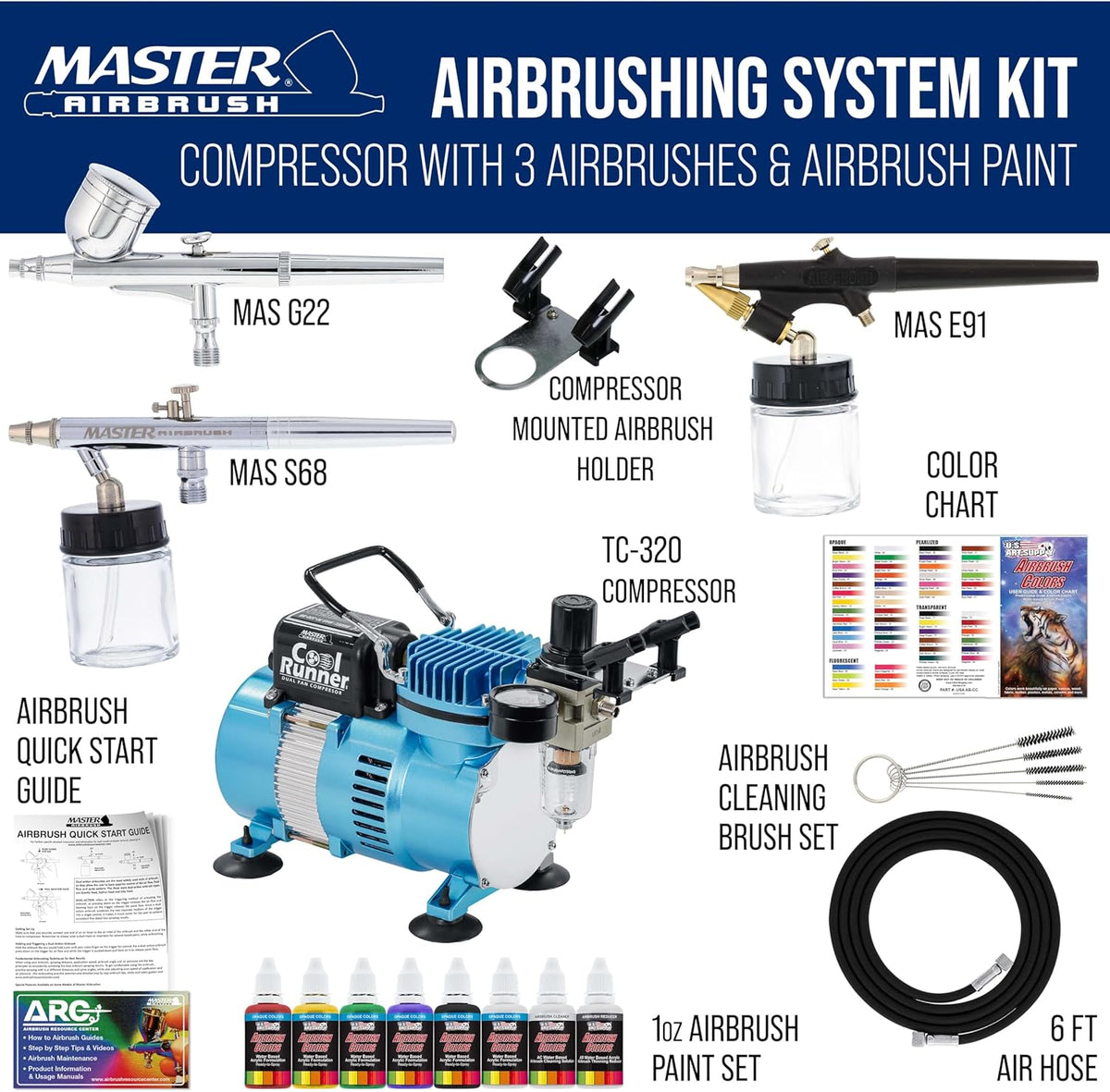 A complete, professional-grade airbrushing system featuring the Cool Runner II dual-fan compressor, three versatile airbrushes, acrylic paint set, cleaning tools, and a step-by-step airbrush guide—perfect for beginners, hobbyists, artists, and model makers.