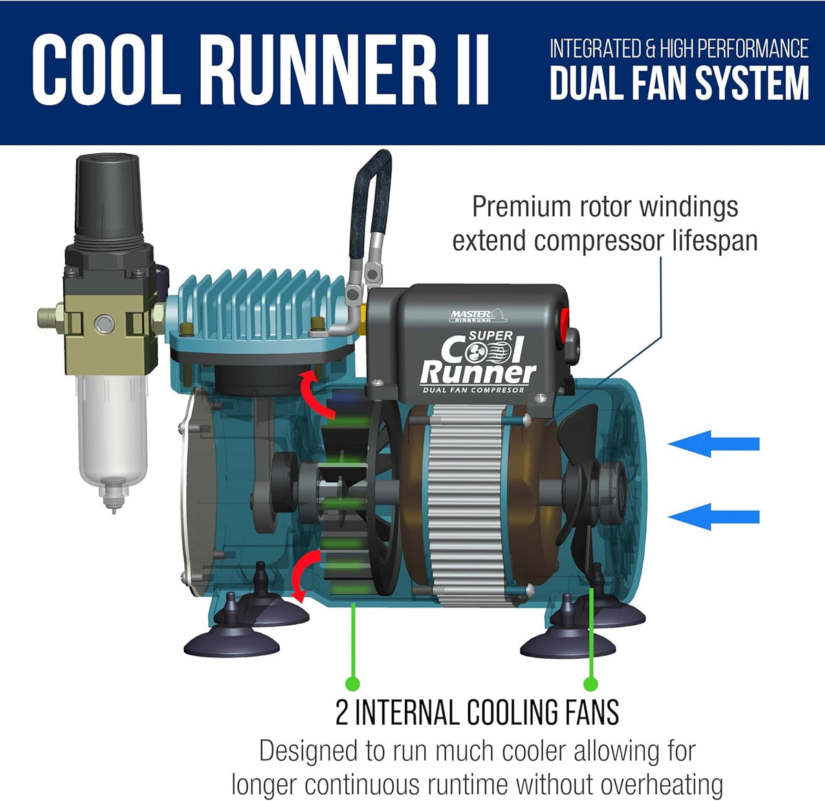 The Master Airbrush Cool Runner II Kit delivers a powerful, reliable, and user-friendly airbrushing experience for artists of all skill levels. Its 1/5 HP single-piston compressor features dual built-in cooling fans, allowing longer continuous use without overheating—ideal for detailed projects like model painting, cake decorating, automotive touch-ups, crafts, tattoos, and more.