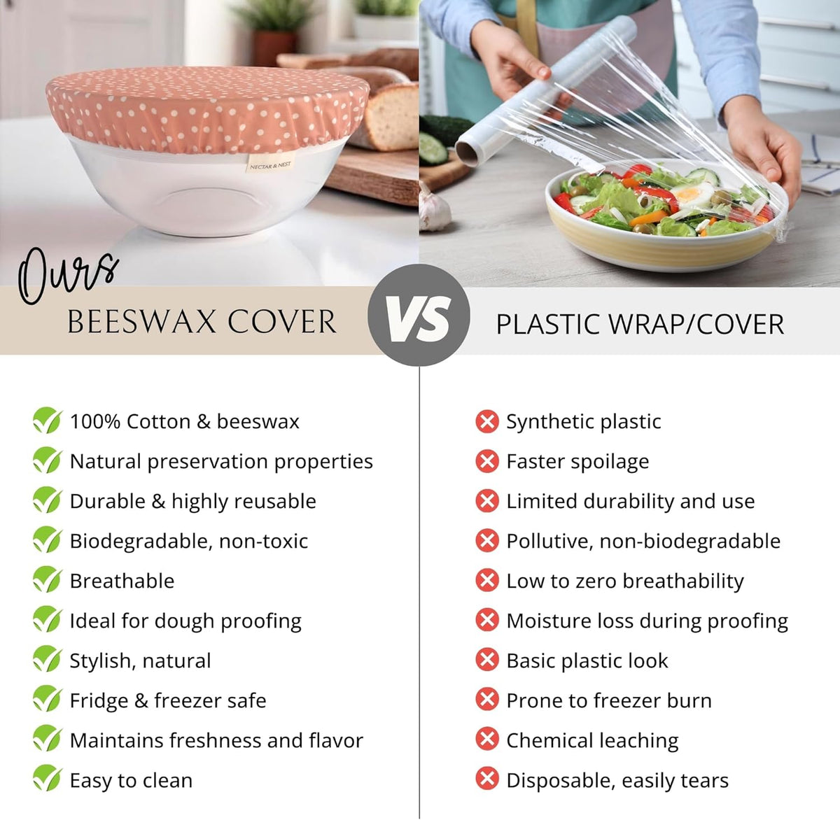 • 100% Natural & Sustainable Materials – Made from organic cotton and natural beeswax; reusable, fridge-safe, freezer-safe, and compostable.
