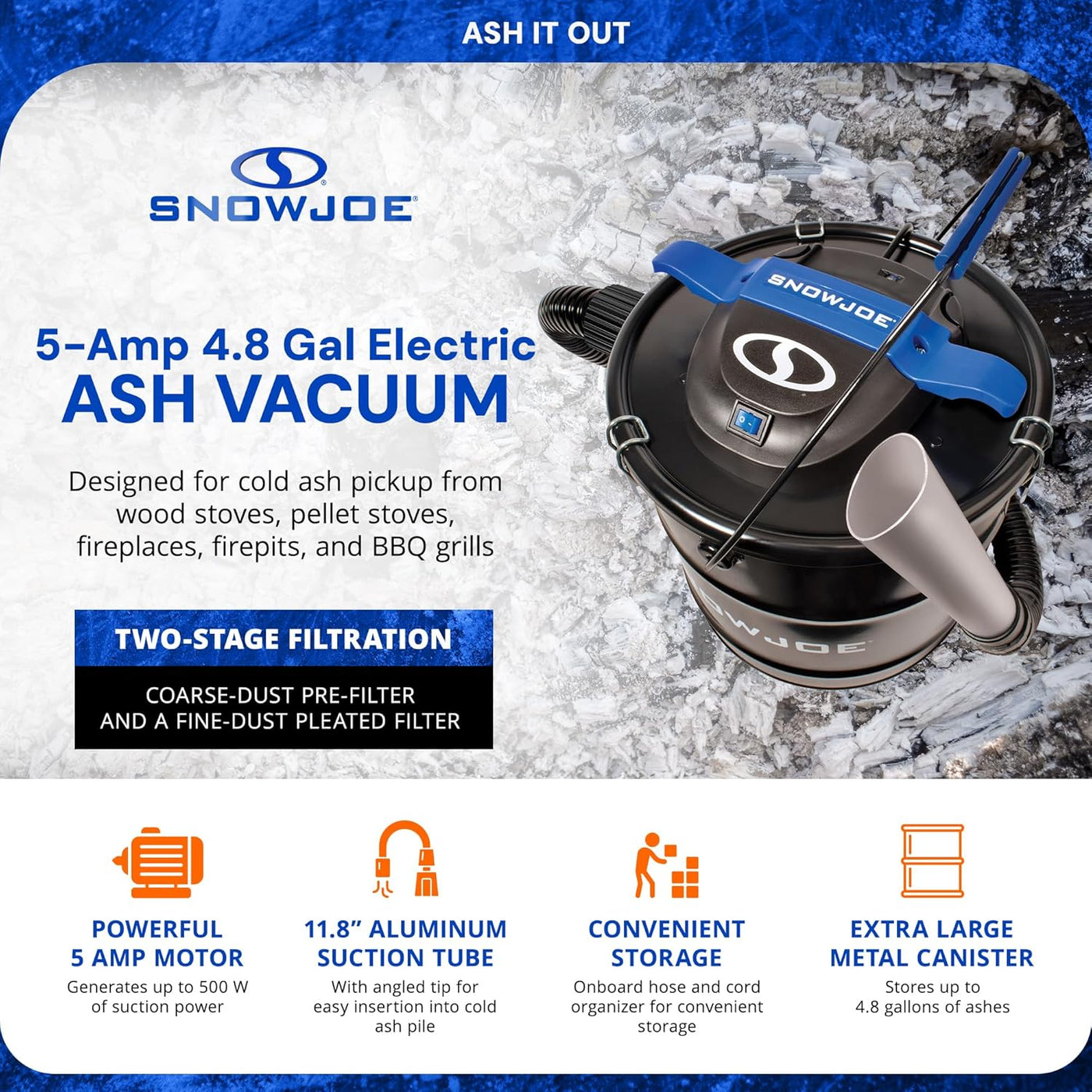 Make ash cleanup quick, clean, and hassle-free with the Snow Joe ASHJ202E Ash Vacuum. Designed specifically for cold ash pickup, this bagless electric vacuum is ideal for fireplaces, wood-burning stoves, pellet stoves, fire pits, and grills—without the mess of traditional vacuums.