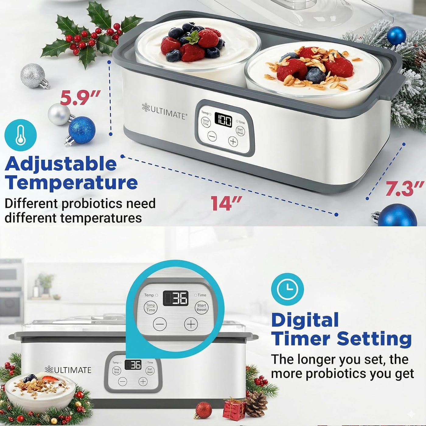 The Ultimate Probiotic Yogurt Maker allows you to culture high-potency probiotics at home with adjustable time and temperature control. With two 1-quart glass containers and a BPA-free design, it’s built for larger batches, clean fermentation, and consistent results—backed by a lifetime warranty.