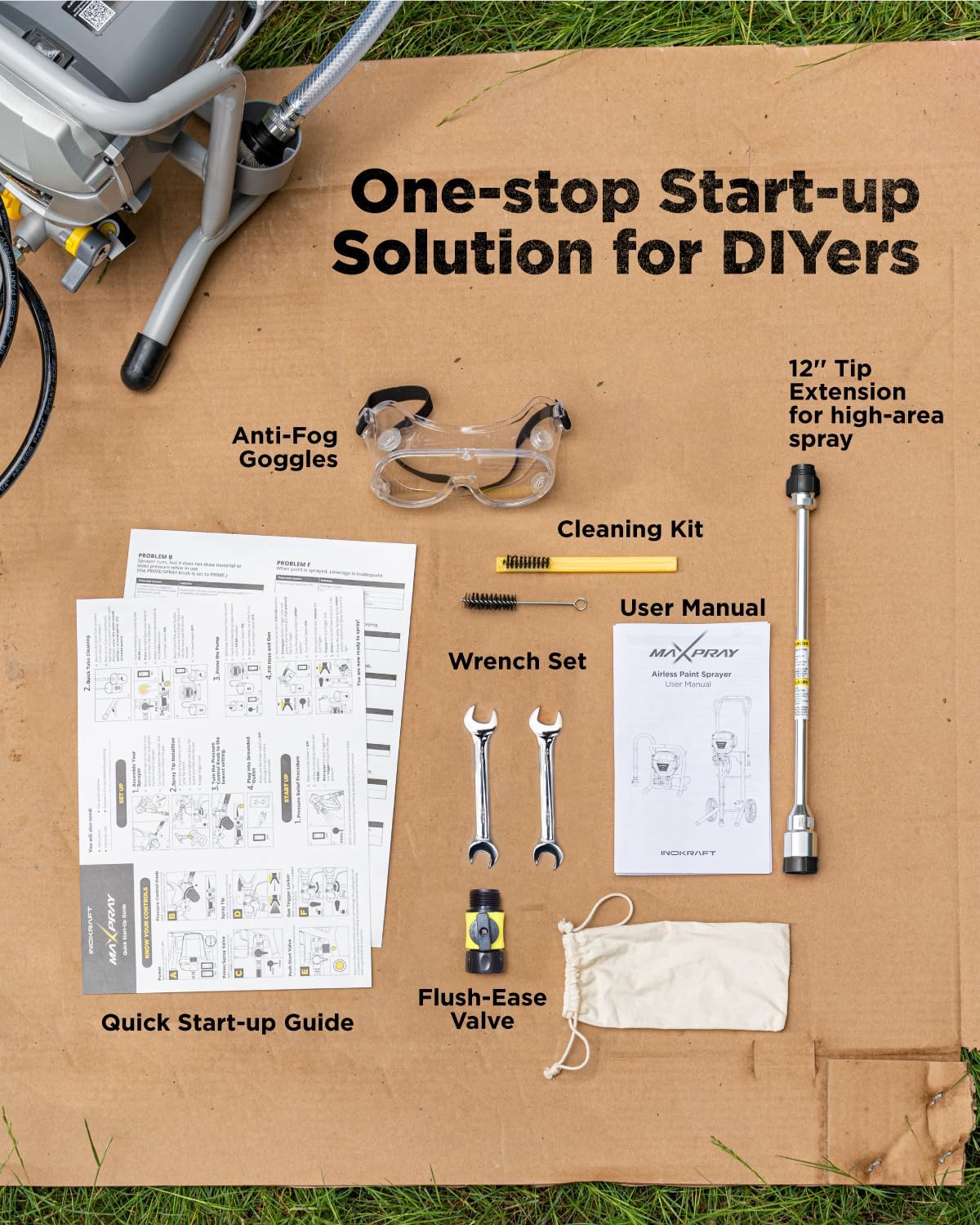 The included accessories add real value rather than feeling like filler. A tip extension helps reach high or awkward spots without overextending your arms, while protective goggles and a cleaning kit make the overall experience safer and more convenient. These details make it clear this sprayer is meant to be used, not just stored after one project.