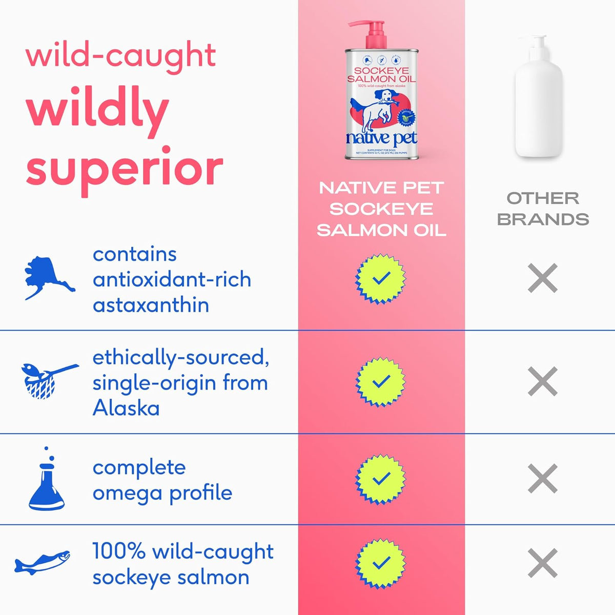 Native Pet Salmon Oil delivers a pure, single-source omega-3 supplement made from 100% wild-caught Alaskan sockeye salmon to support healthier skin and coat, reduced shedding, improved joint mobility, heart health, and overall wellness in dogs and cats.