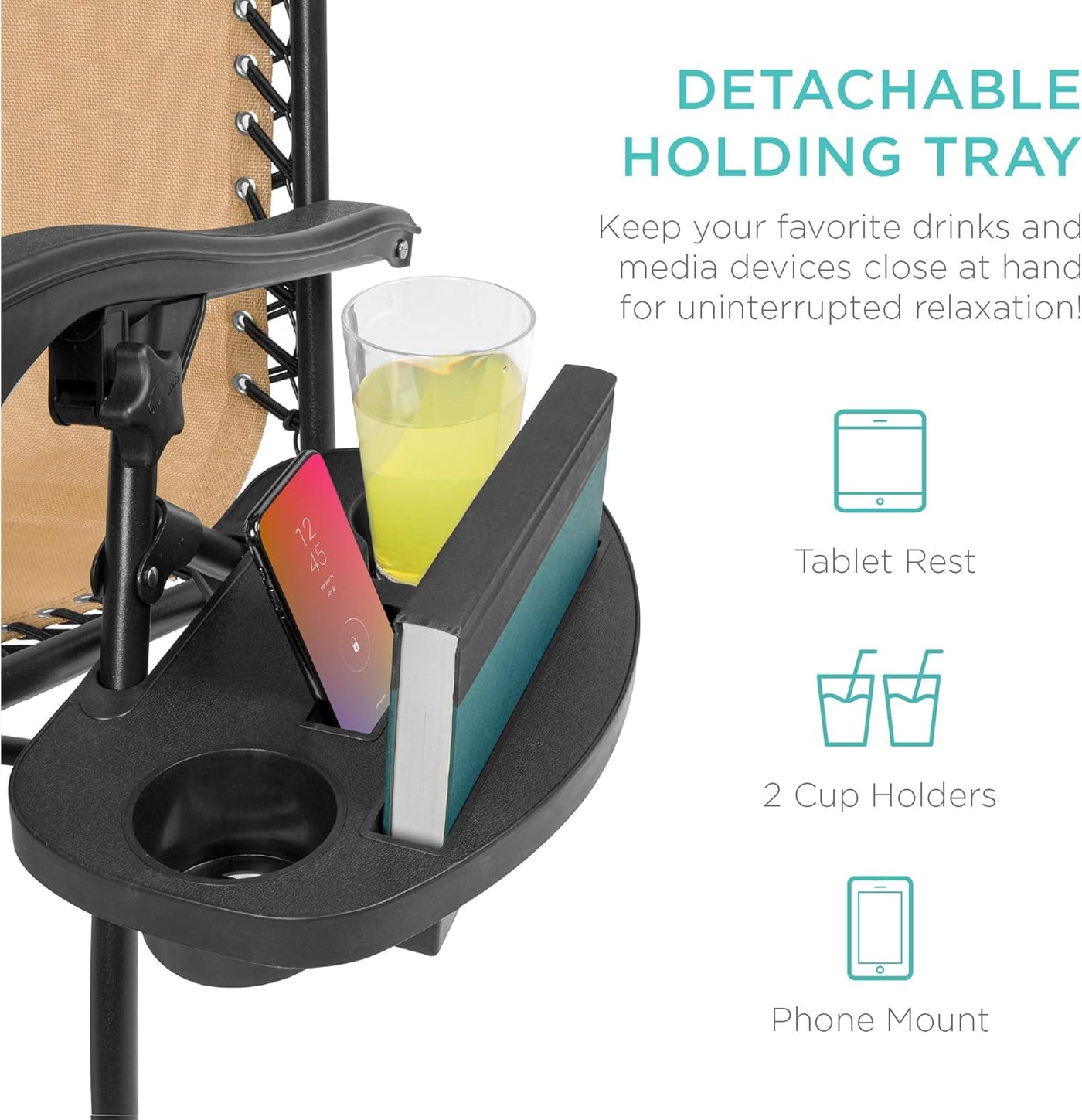 • Detachable Cup Holder Tray – Includes two cup holders plus phone and tablet slots to keep drinks and devices within reach