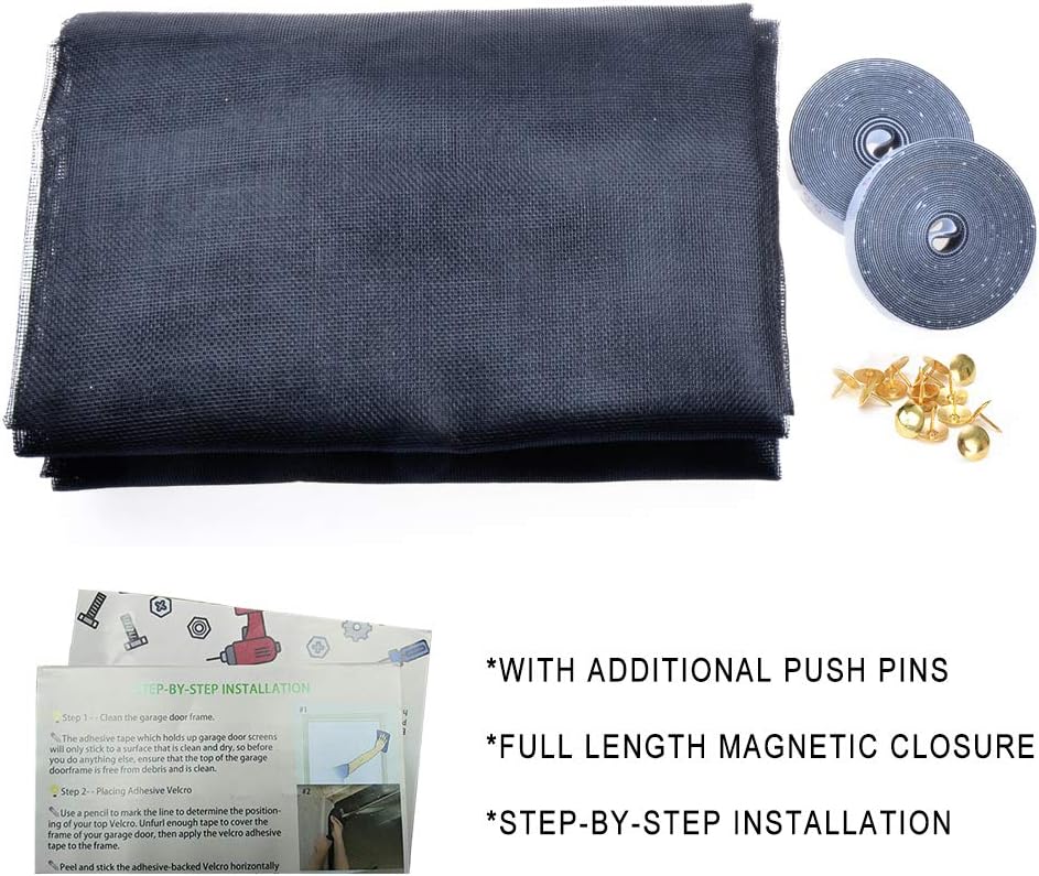 Installation is straightforward and does not require tools or drilling. Hook-and-loop strips attach the screen to the garage frame, and included push pins provide added reinforcement if needed. Because the screen is frameless and retractable, it can be removed or folded up for seasonal storage without taking up much space.