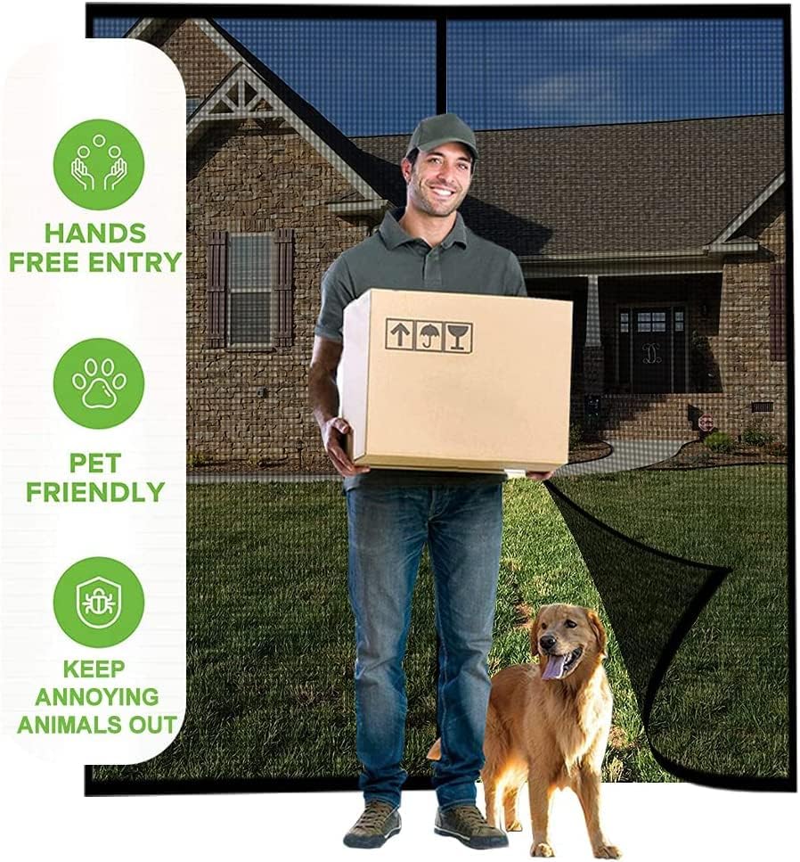 The center opening uses strong magnets paired with additional weighted gravity sticks along the bottom edges. This combination allows the screen to close automatically after walking or driving pets through, while also helping it stay in place during light wind. The pass-through design works for both people and pets without requiring hands to open or close the screen.