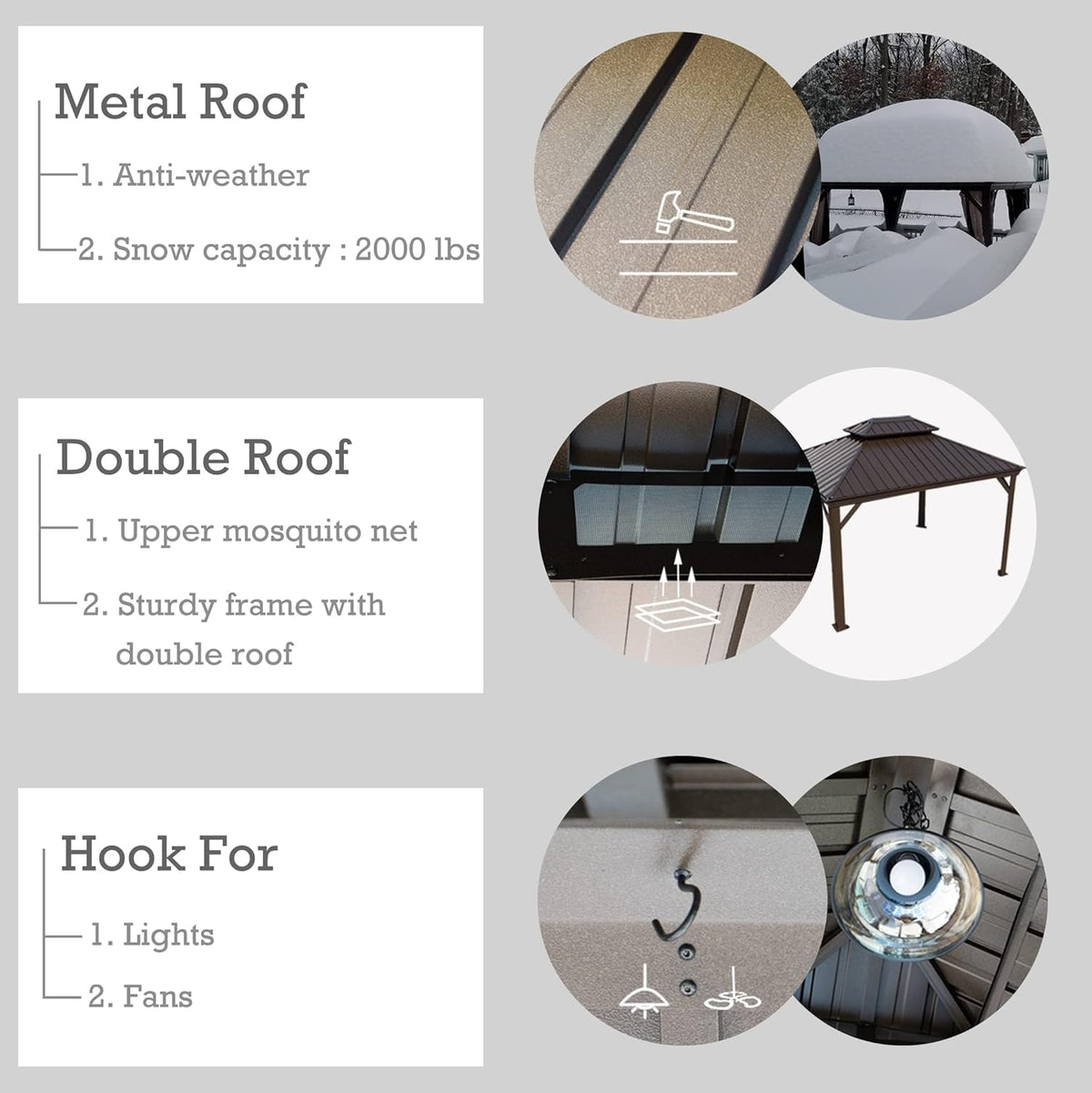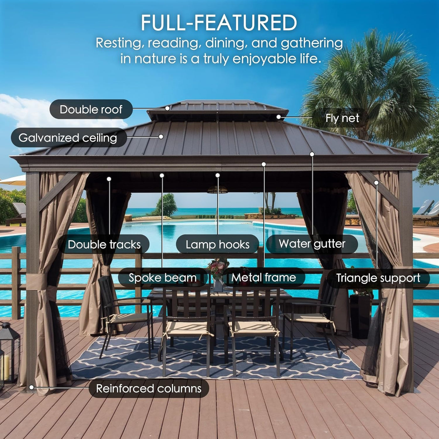 The galvanized steel double-roof system enhances airflow while reducing heat buildup and wind stress. Thicker 29-gauge steel panels provide superior durability compared to standard hardtop gazebos, while the integrated gutter system channels rainwater neatly through the poles to keep your patio area dry.