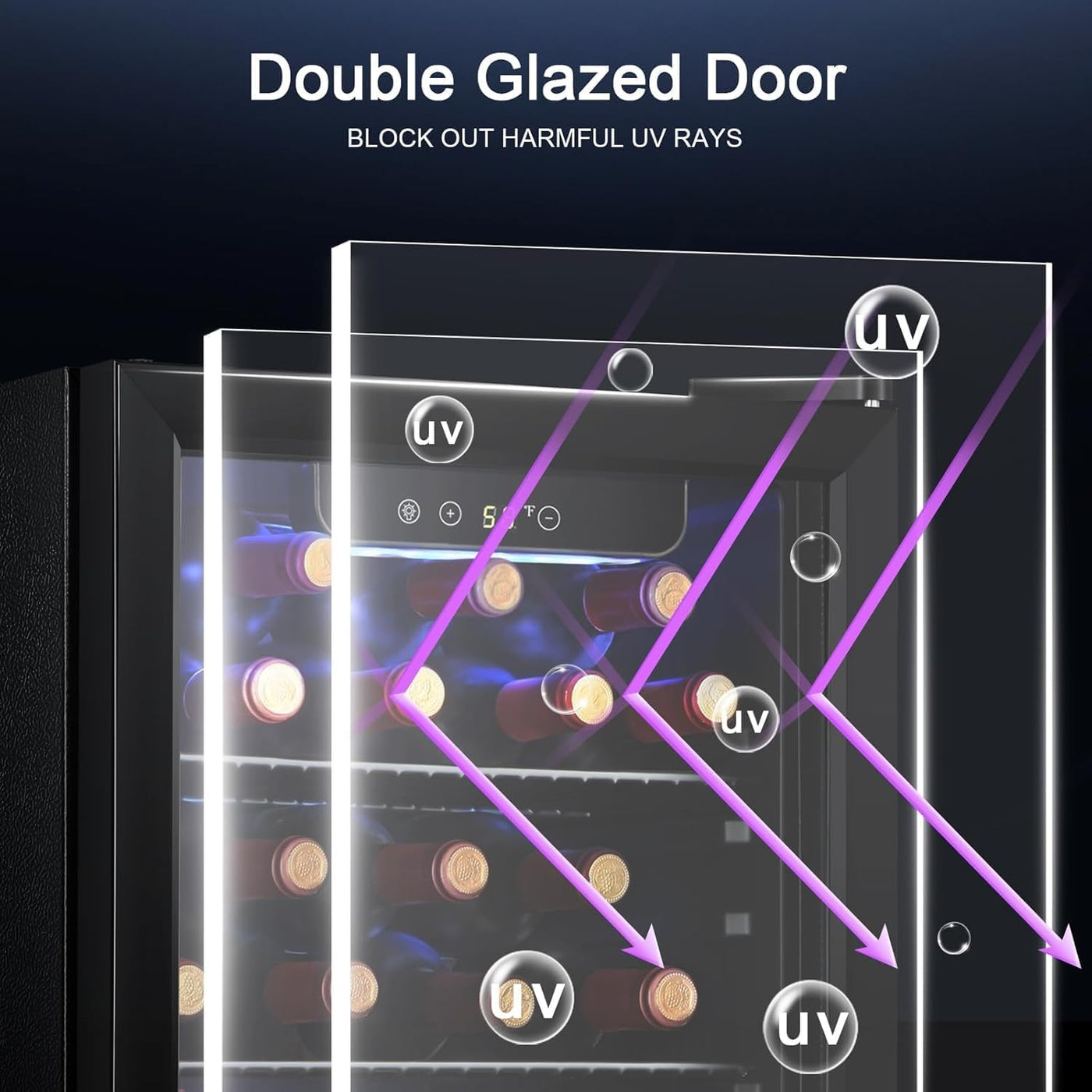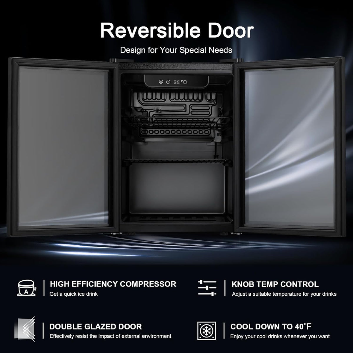 Its digital temperature control panel lets you fine-tune cooling between 40°F–61°F, while advanced compressor technology ensures stable, consistent temperatures even when room conditions fluctuate. The double-pane tempered glass door enhances insulation, reduces UV exposure, and lets you monitor contents clearly at a glance. Blue LED lighting adds a modern touch and lets you locate drinks effortlessly at night.