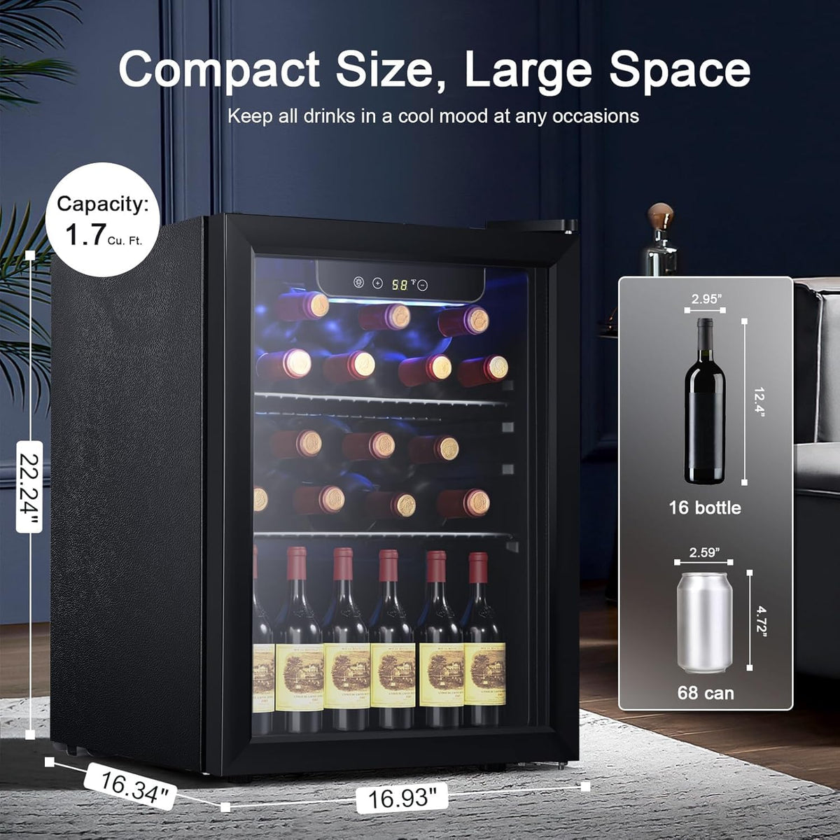 Stores up to 16 wine bottles or 68 cans inside a 1.7 cu. ft. unit, with adjustable shelves for flexible organization.